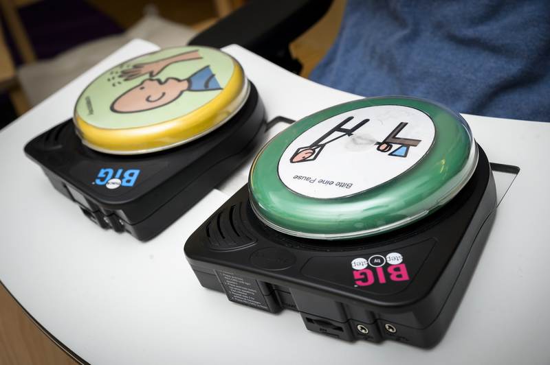 Foto: Zwei Tasten mit Symbolen zur Unterstützten Kommunikation, Fotocredit: Ulrike Rauch