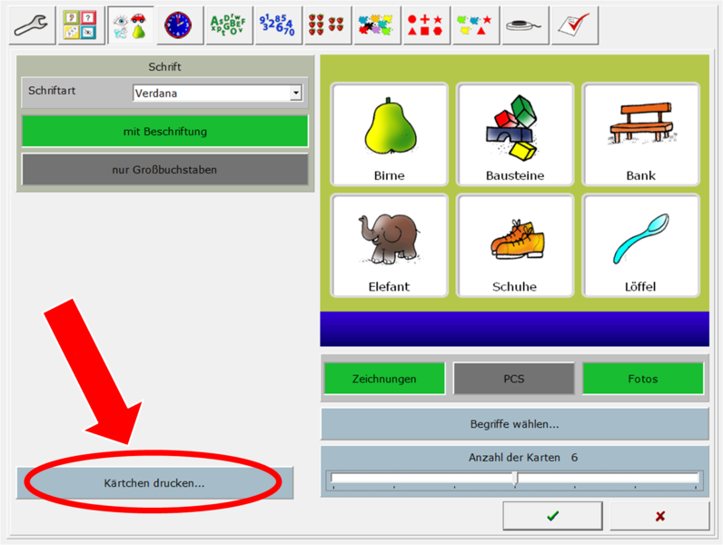die Bilder nur einmal ausdrucken und eigene Kärtchen mit zugehörigem Schriftbild erstellen, dh zu einem Begriff gehört immer ein Bild/Foto-Kärtchen und ein Schriftbild-Kärtchen