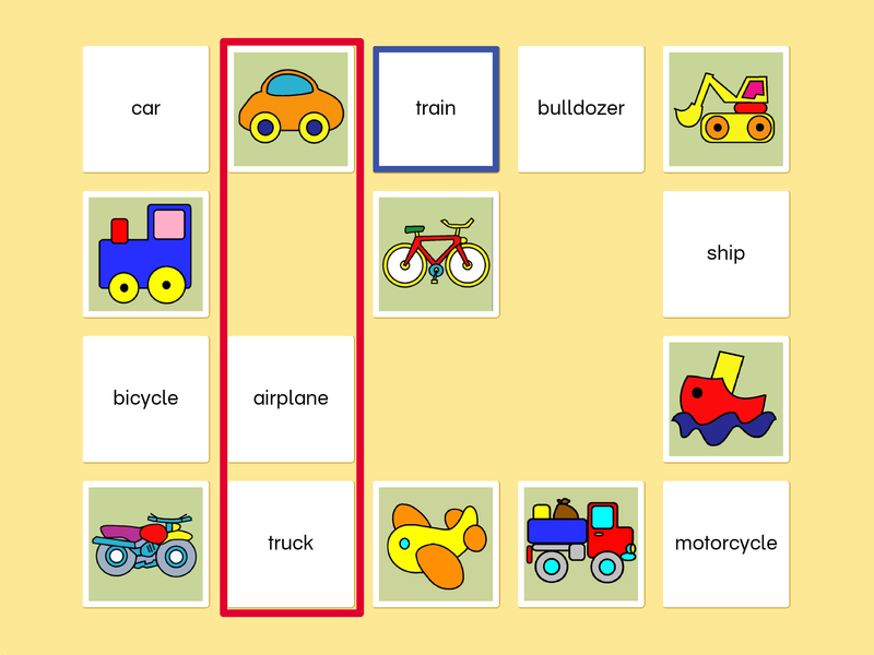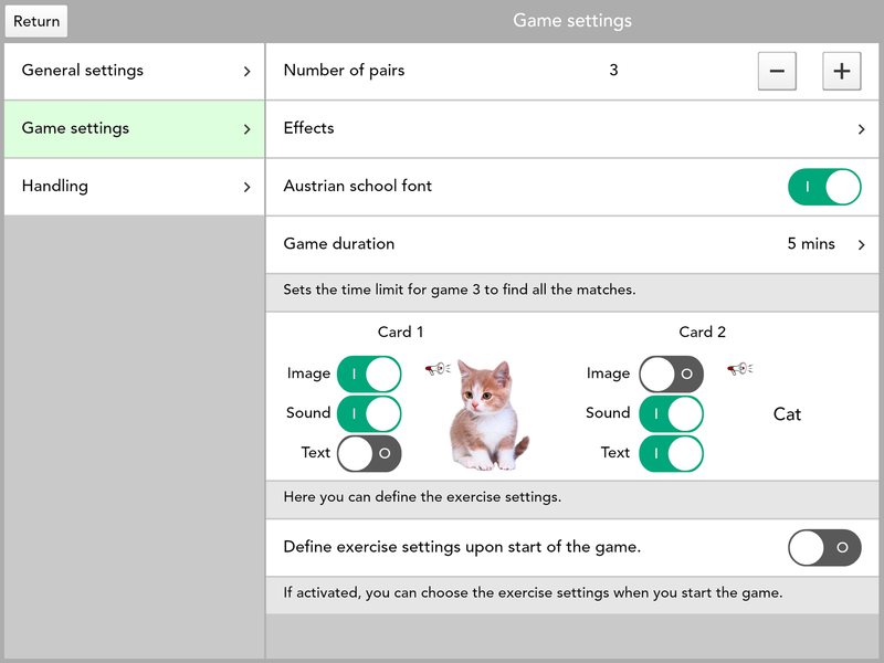Each card can contain pictures, text and sound. Depending on the selected settings, different combinations can be used in addition to the classic mode (match pictures), e.g. matching sound and picture, matching text and sound, and so on.