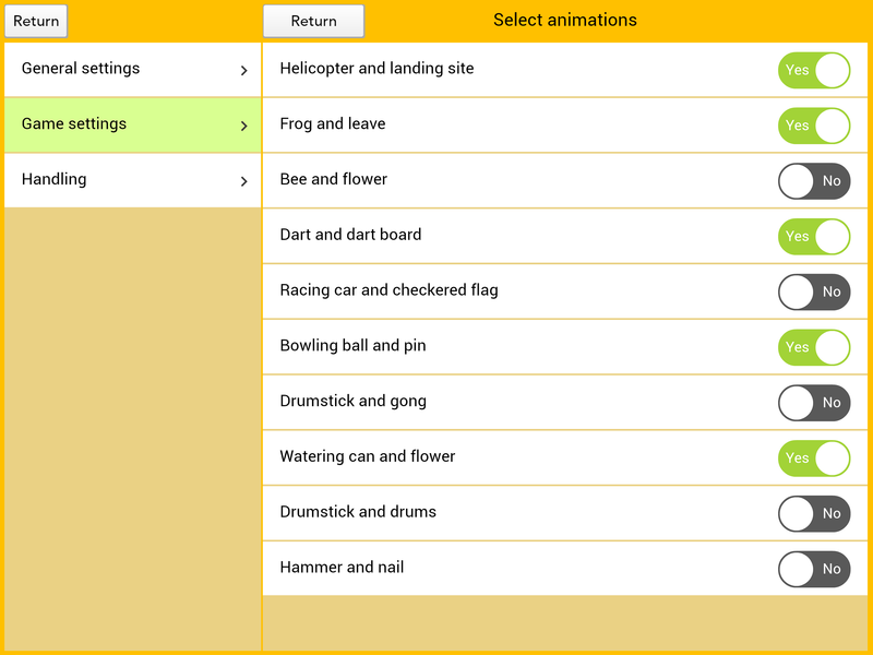 The aim of this exercise is to recognize the presented object and to touch it. Every correct input will be confirmed with a short feedback. After a predefined number of correct inputs, a reward animation will be played. The level of difficulty will adjust automatically to the skill of the user. At the beginning the objects are big but they will be reduced in size gradually.